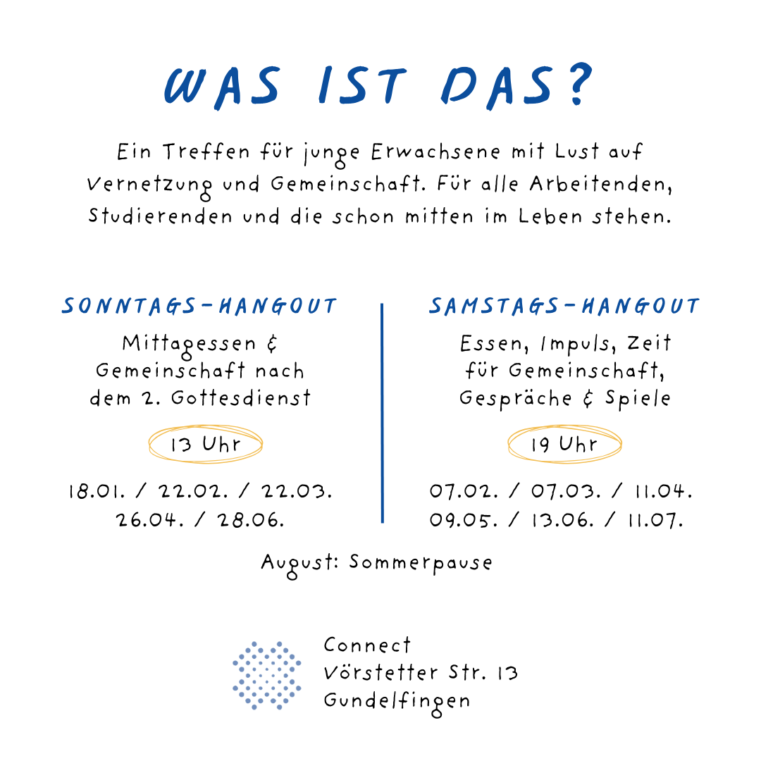 Bei unserem Samstags-Hangout beginnen wir mit leckerem Essen & Getränken. Es gibt meistens einen ermutigenden Impuls. Viele Leute in deinem Alter. Zeit, um über Gott und die Welt zu reden. Und viel Zeit für Spiele. Also bring gerne auch dein Lieblingsspiel mit.
